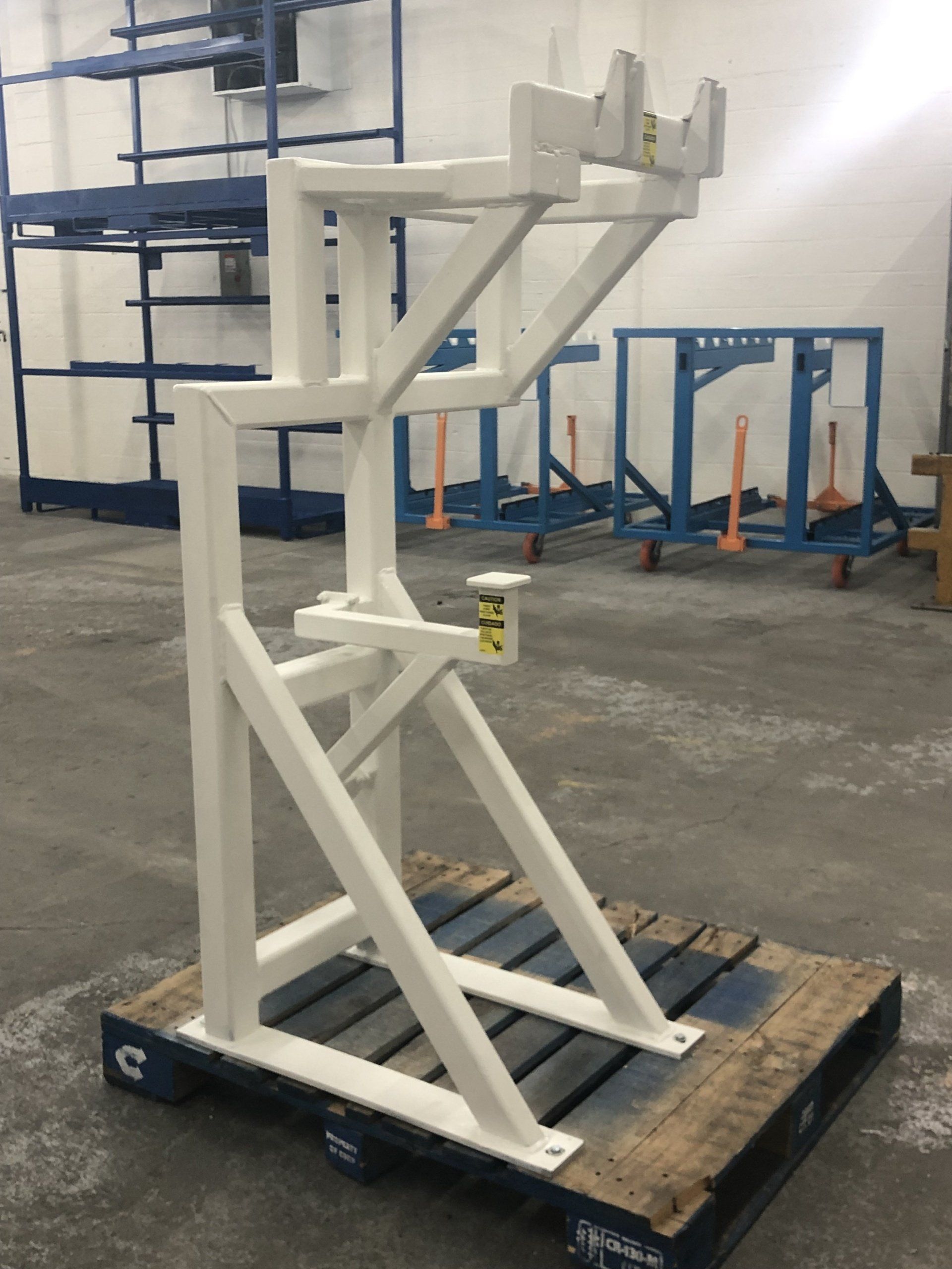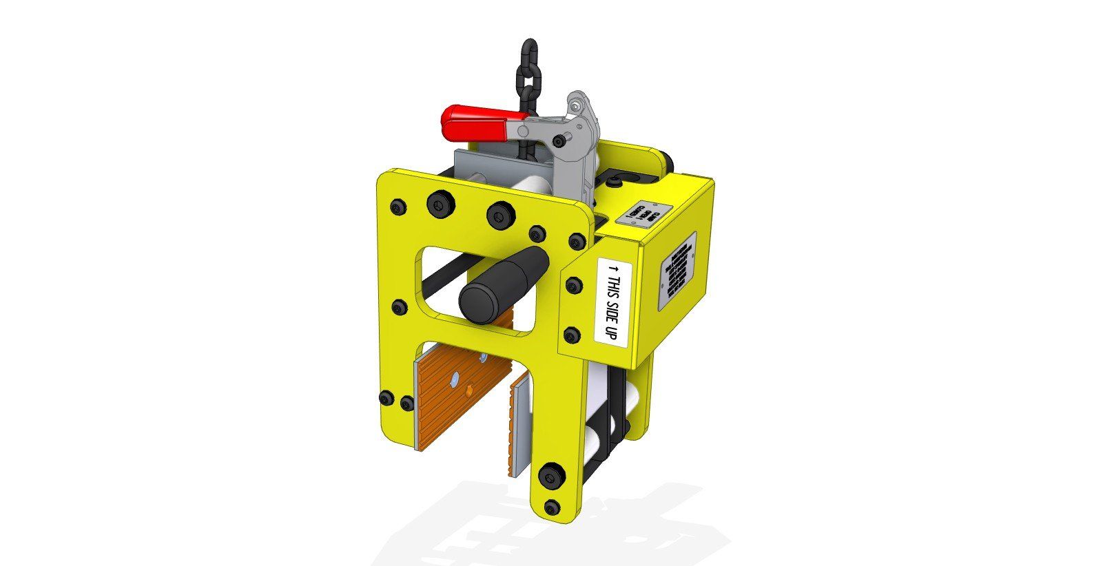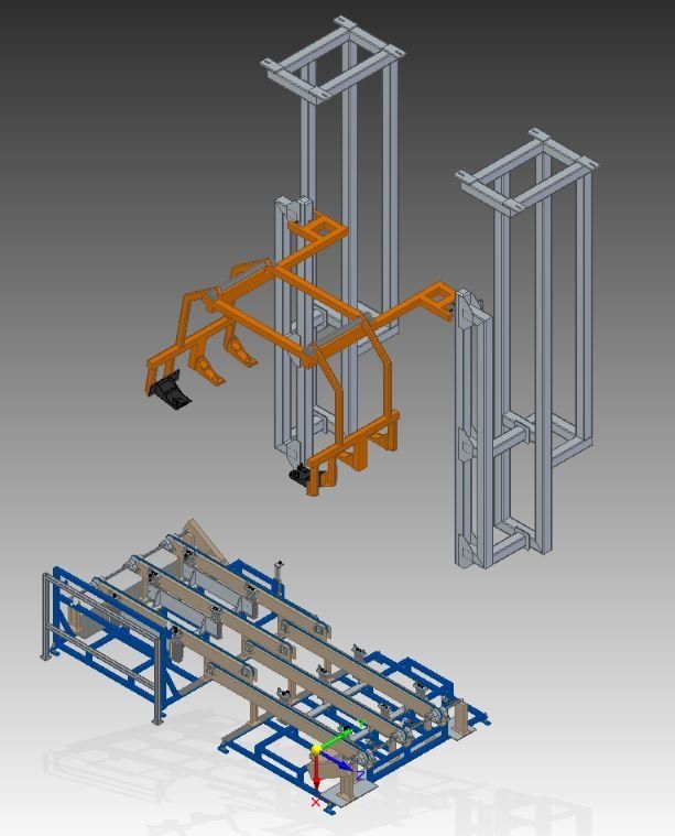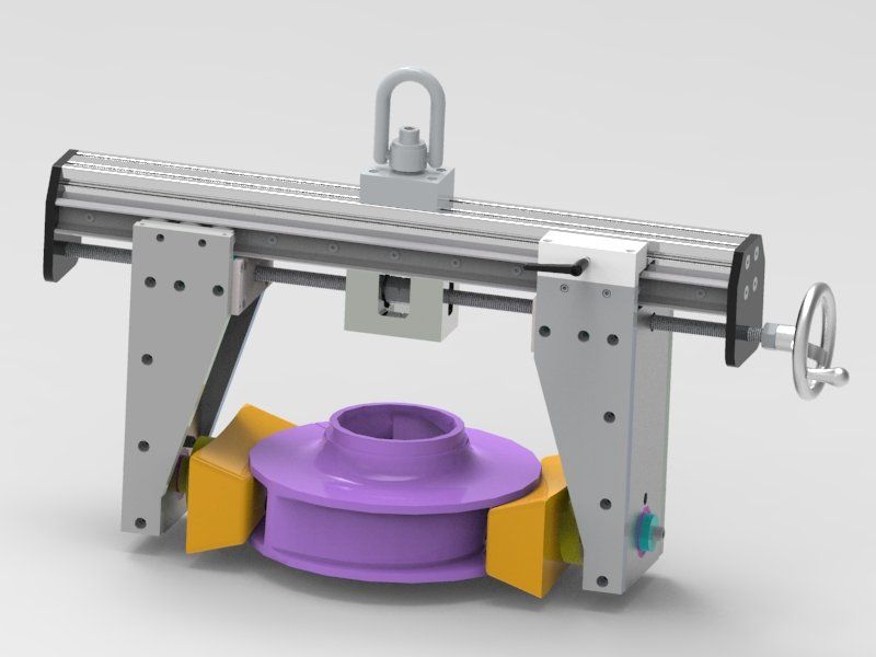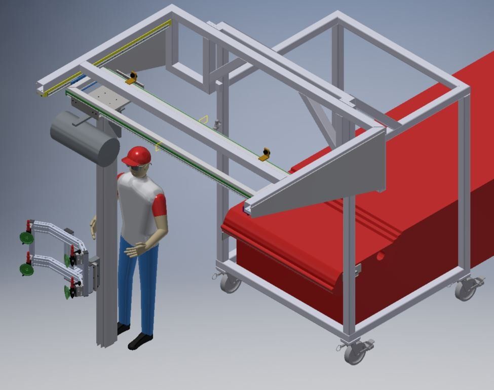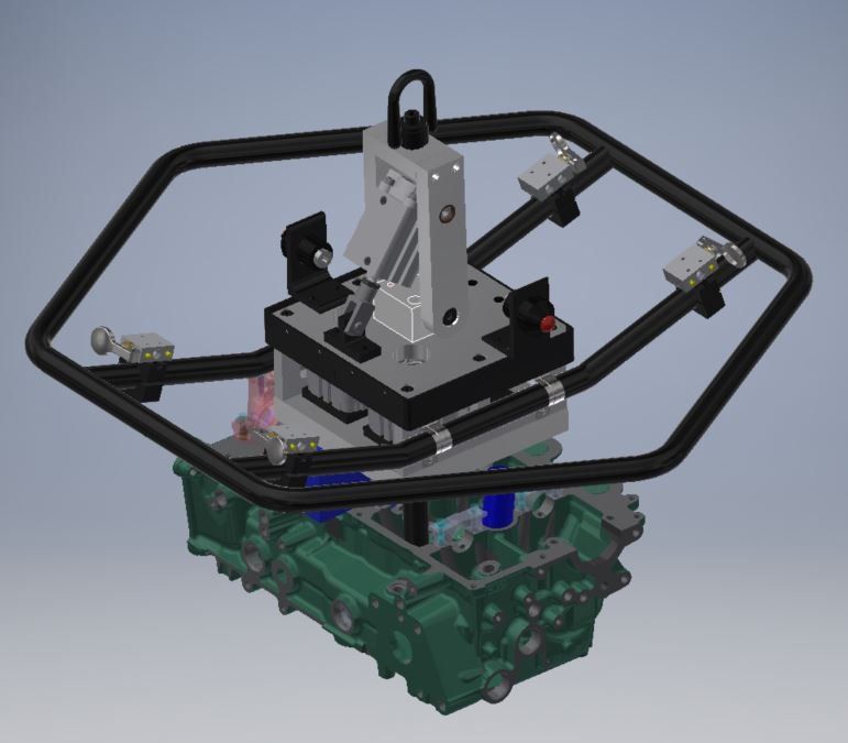 One of our most recent projects was for a company that had to lift a heavy part out of their machine using straps before flipping it over by hand and putting it back into the machine. After meeting with them and finding out the capability of their facility we recommended a custom lift assist that would be attached to their existing overhead crane. Once built this lift assist would not only make it easier to remove the part from the machine, but it would also flip the part over for them. We started the process by making several CAD model concepts that eventual, through several personal and digital meetings with the customer, became finalized into the model shown below on the left. After customer approval of the model, we created a TDP (Technical Drawing Package) and had the prototype shown below on the right created. For this particular job, only one lift assist was needed, so after the prototype worked without any problem it became the final product. For other projects that call for large production quantities we would send the customer a quote to build production, and send them the finalized TDP so they could have the final product individually quoted.