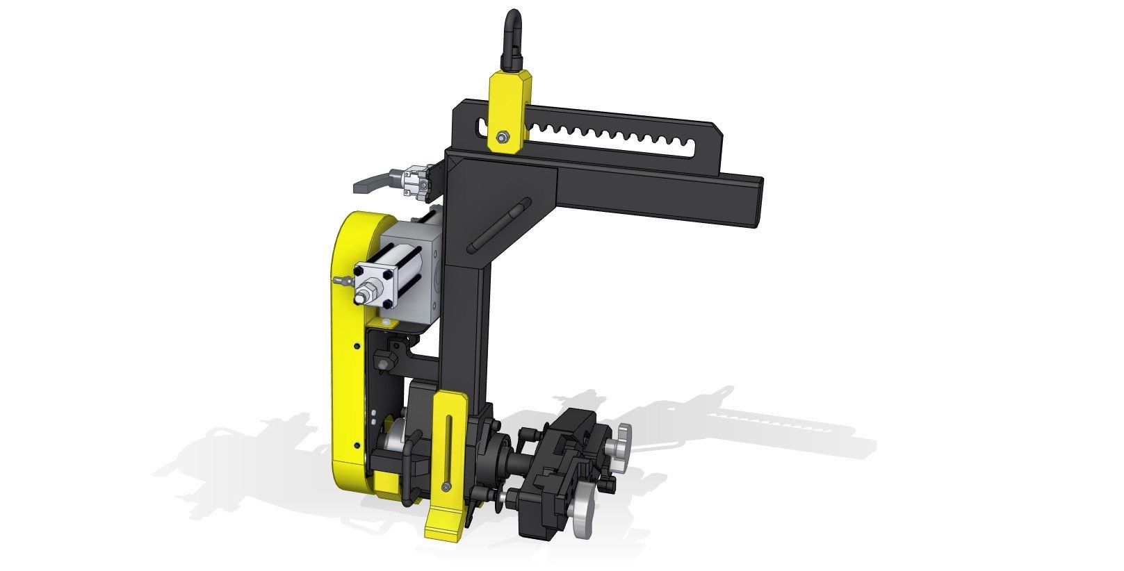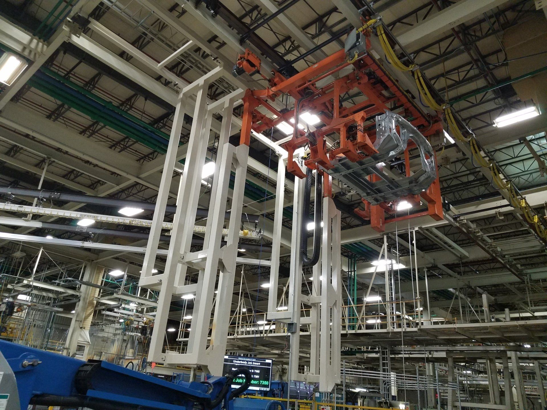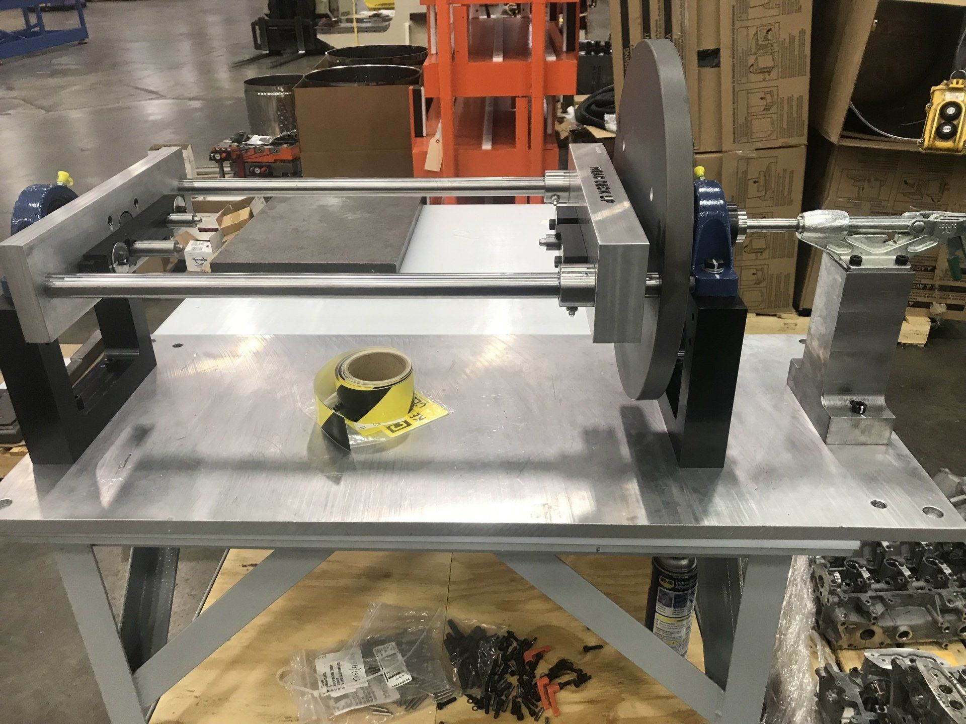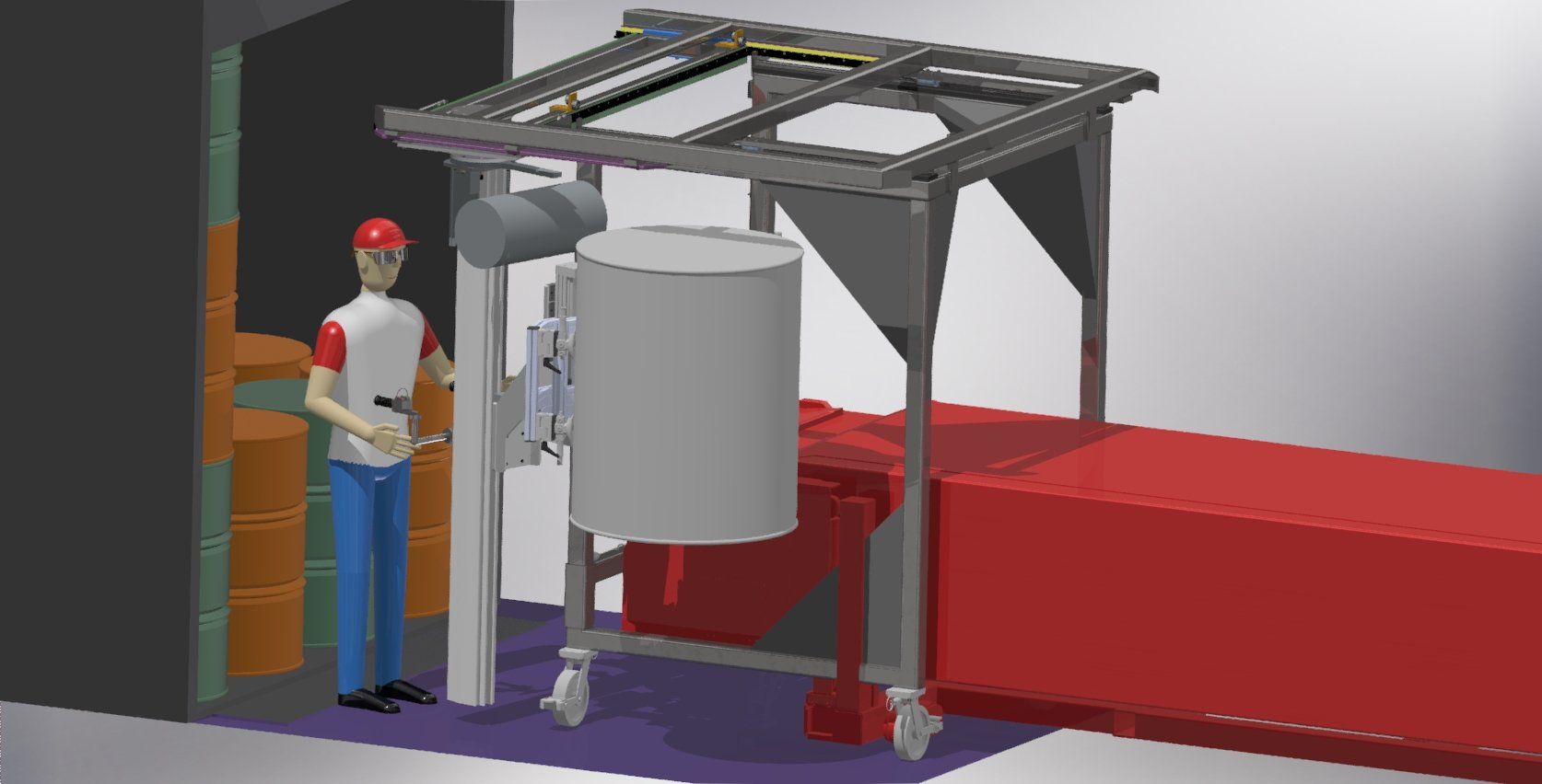 One of our most recent projects was for a company that had to lift a heavy part out of their machine using straps before flipping it over by hand and putting it back into the machine. After meeting with them and finding out the capability of their facility we recommended a custom lift assist that would be attached to their existing overhead crane. Once built this lift assist would not only make it easier to remove the part from the machine, but it would also flip the part over for them. We started the process by making several CAD model concepts that eventual, through several personal and digital meetings with the customer, became finalized into the model shown below on the left. After customer approval of the model, we created a TDP (Technical Drawing Package) and had the prototype shown below on the right created. For this particular job, only one lift assist was needed, so after the prototype worked without any problem it became the final product. For other projects that call for large production quantities we would send the customer a quote to build production, and send them the finalized TDP so they could have the final product individually quoted.